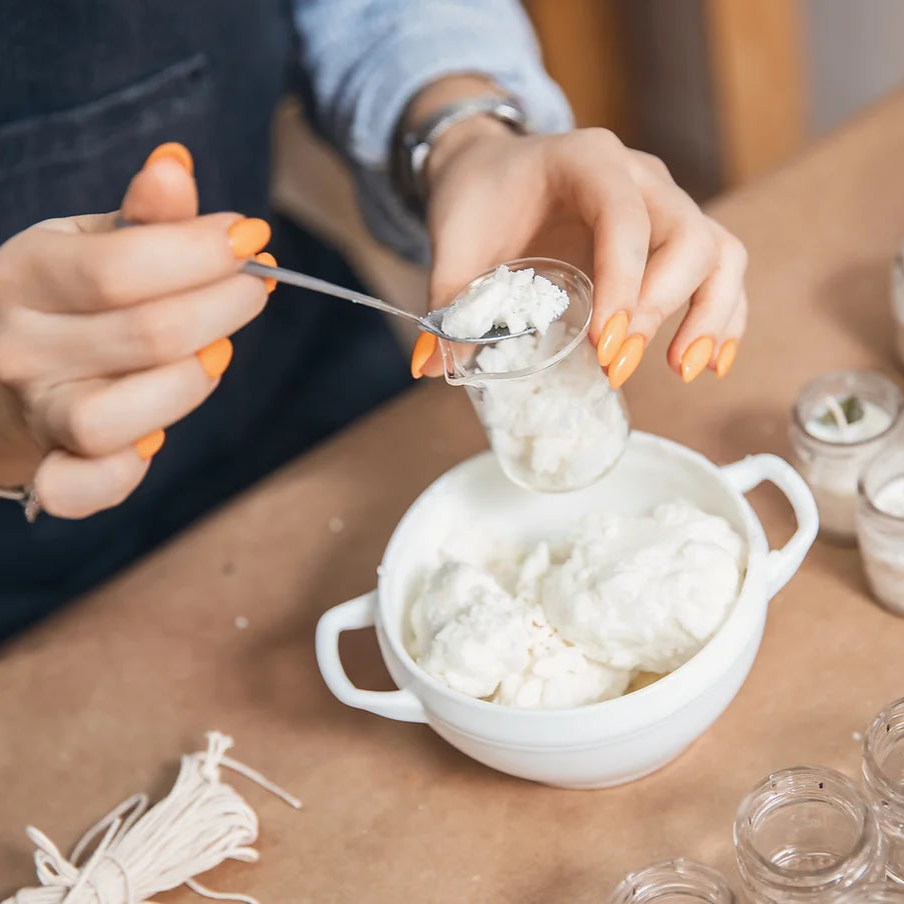 We start by carefully choosing a blend of natural waxes, such as soy and beeswax, known for their clean-burning properties and sustainability.